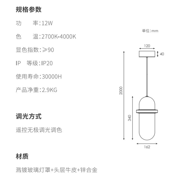 美时吊灯灵感源自早晨的光线,,穿透云雾渺渺的大气层洒到地上。。美时外层的玻璃自上而下从深色到透明的渐变镀层还原了这一情境,,,,光透过双层玻璃形成丰富的折射效果,,,,一如破晓时的光线充满朝气,,,,采用上下两路光组合,,,,下路光直出提供主要光线,,,,上路光提供氛围光。。。。上路光在手工吹制玻璃的不规则壁厚折射下,,,,呈现了极其丰富的变化,,,,采用头层牛皮作为一个点缀,,,缓冲了玻璃与金属带来的冰冷和生硬的感觉,,,取得了视觉的平衡。。。